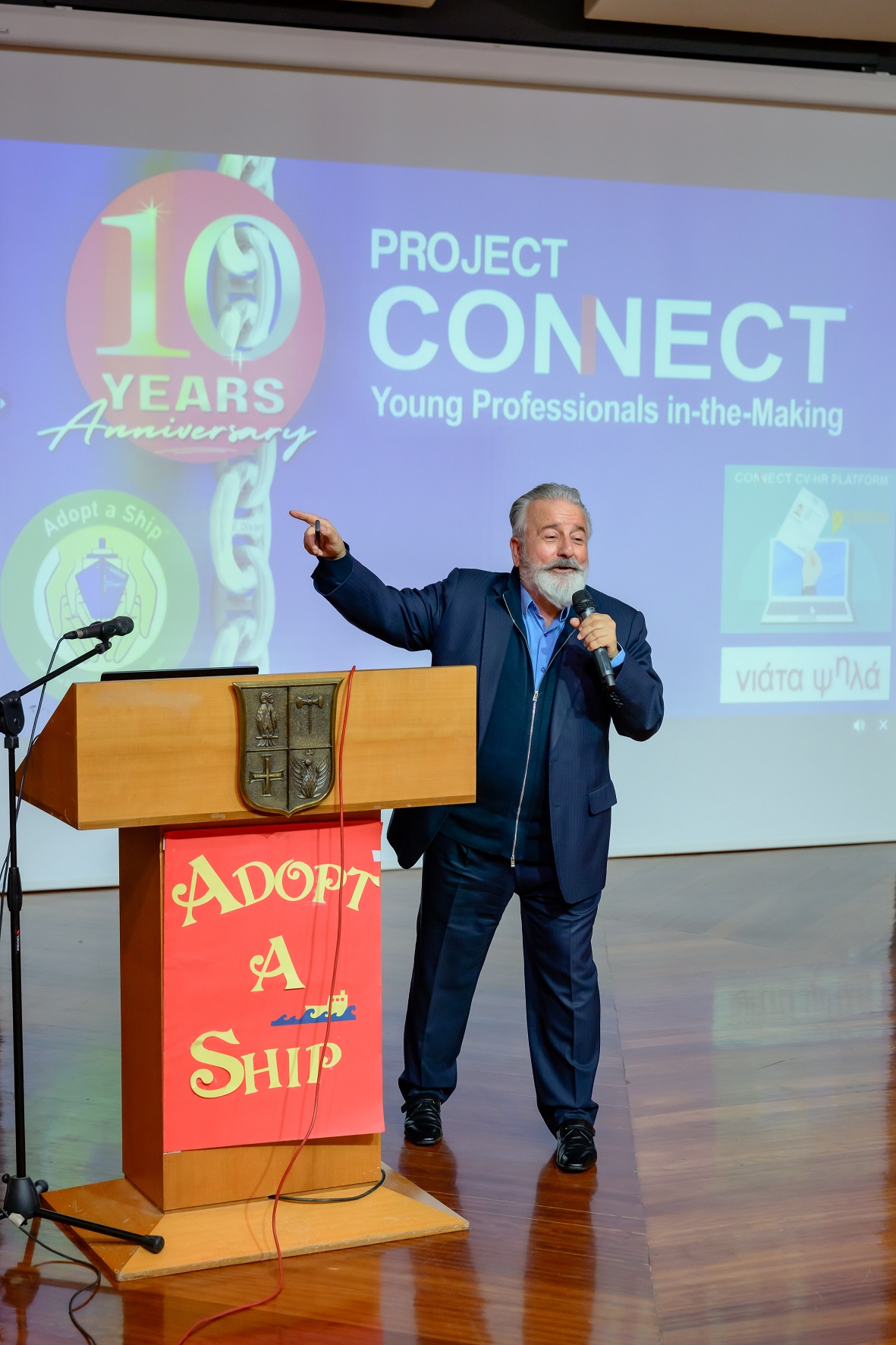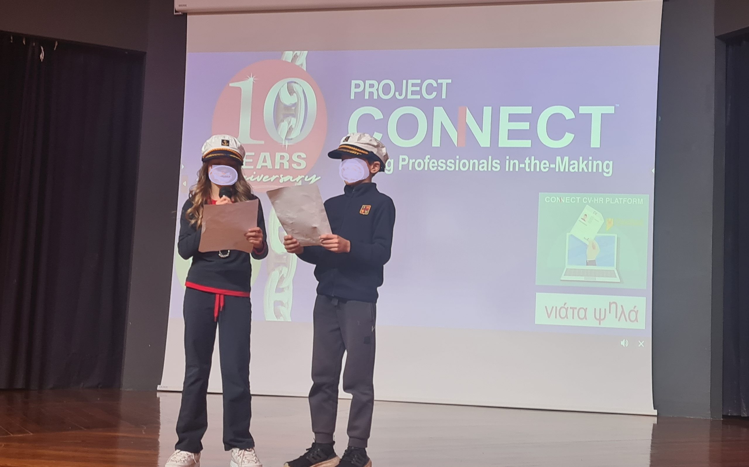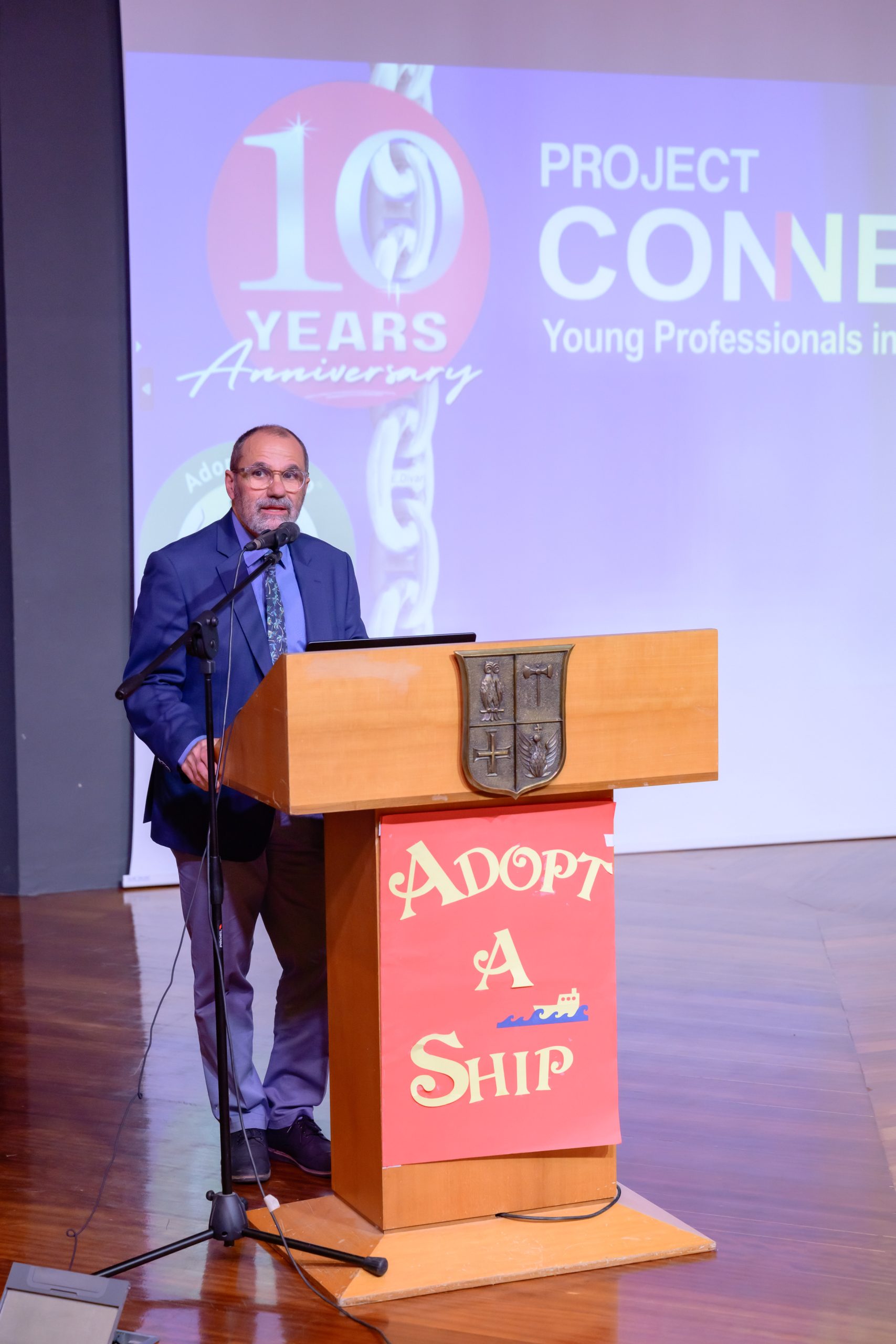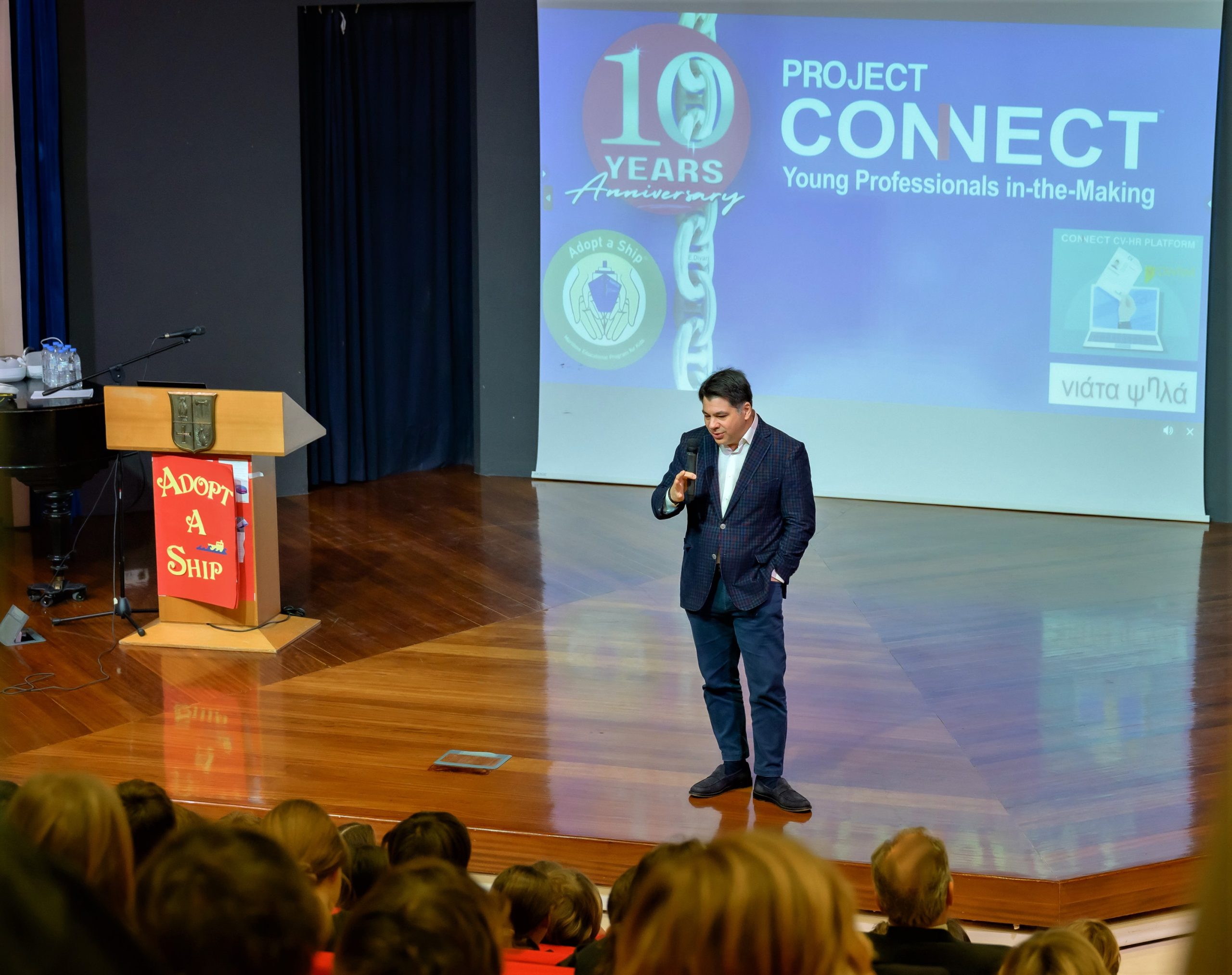 Mr. Chrysostomos Lefteratos, a dedicated Athens College teacher and one of the first educators to adopt the Adopt a Ship program, warmly welcomed students and guests. Athens College has been a consistent participant since the program’s introduction to Greek classrooms in January 2019. Mr. Lefteratos showcased a video highlighting students' shipping-related projects, and he also presented a heartwarming reading of an e-mail exchange between a student and a ship captain, emphasizing the unique interaction at the program’s core. Two students, wearing captain’s hats provided by Project Connect, read aloud a letter exchanged between a Maran Tankers vessel and an elementary class in Davlia, Central Greece.
