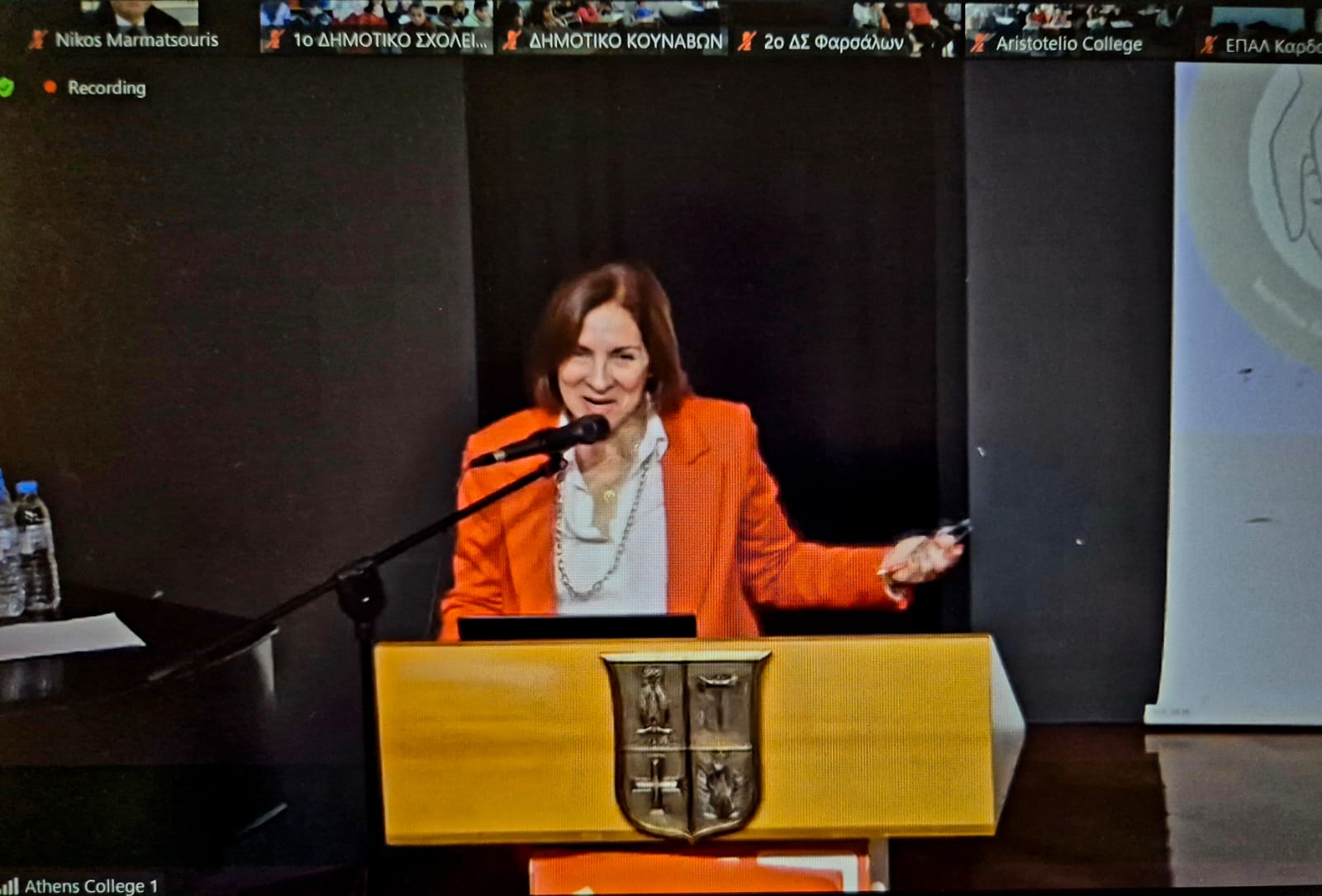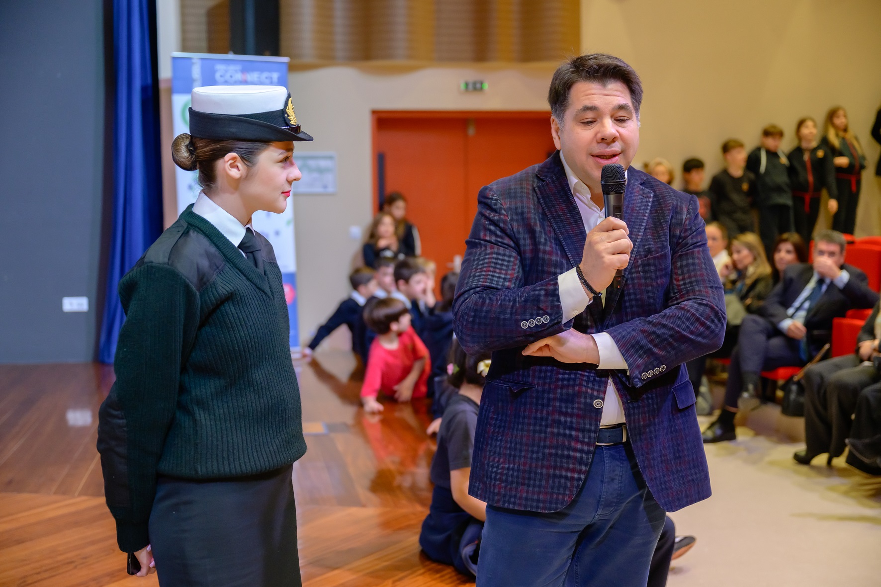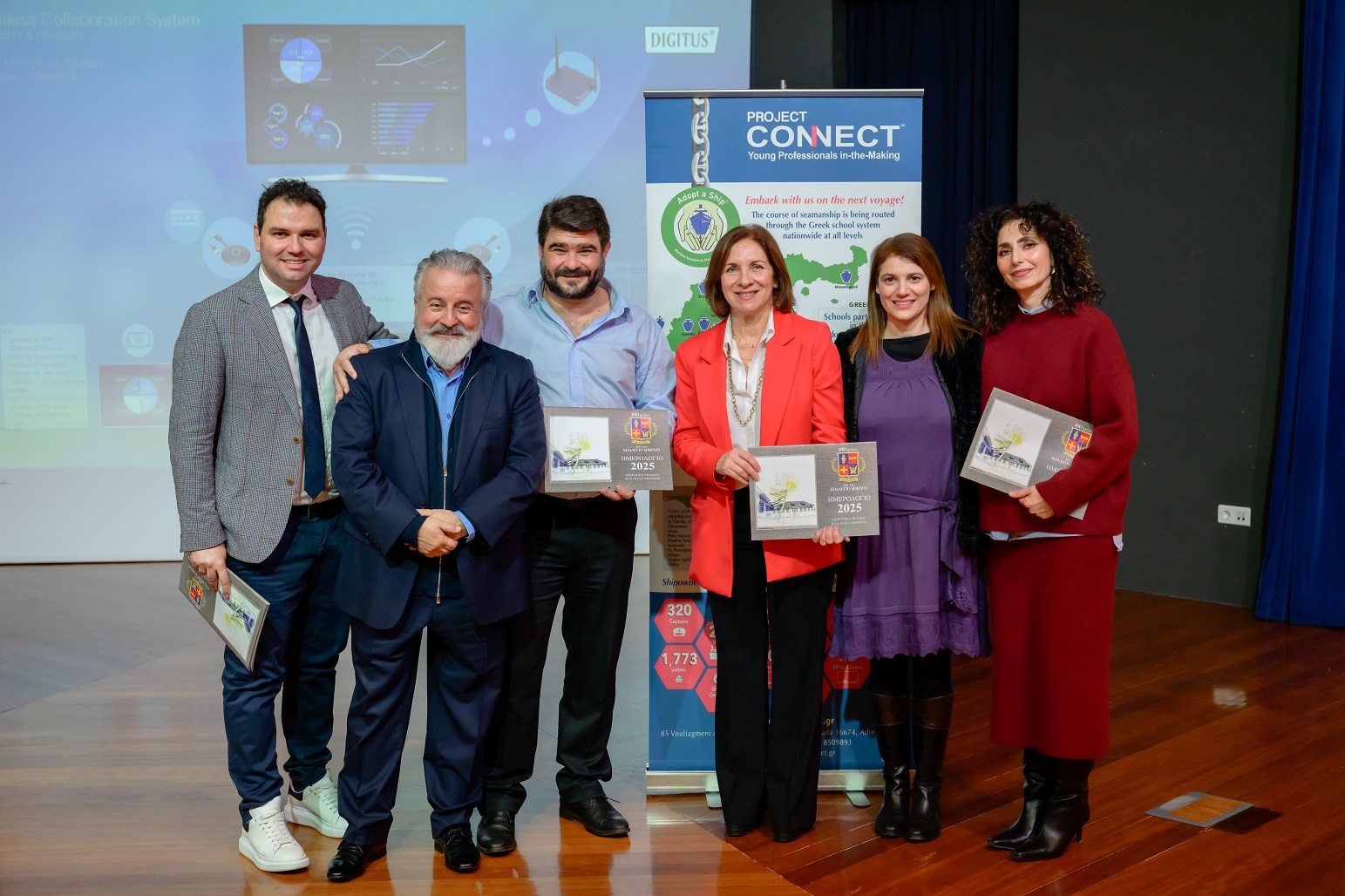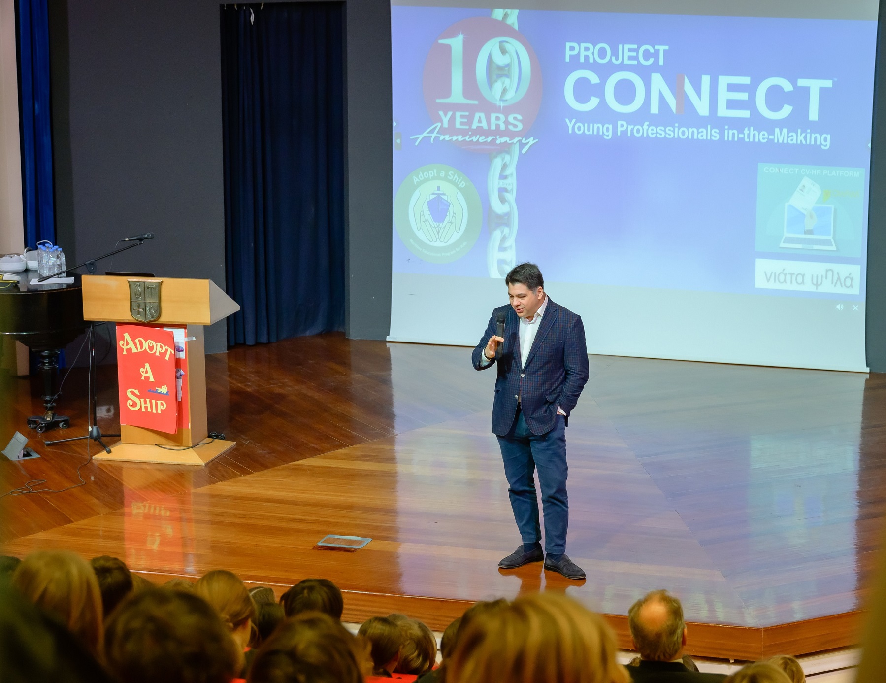 Mr. Chrysostomos Lefteratos, a dedicated Athens College teacher and one of the first educators to adopt the Adopt a Ship program, warmly welcomed students and guests. Athens College has been a consistent participant since the program’s introduction to Greek classrooms in January 2019. Mr. Lefteratos showcased a video highlighting students' shipping-related projects, and he also presented a heartwarming reading of an e-mail exchange between a student and a ship captain, emphasizing the unique interaction at the program’s core. Two students, wearing captain’s hats provided by Project Connect, read aloud a letter exchanged between a Maran Tankers vessel and an elementary class in Davlia, Central Greece.
