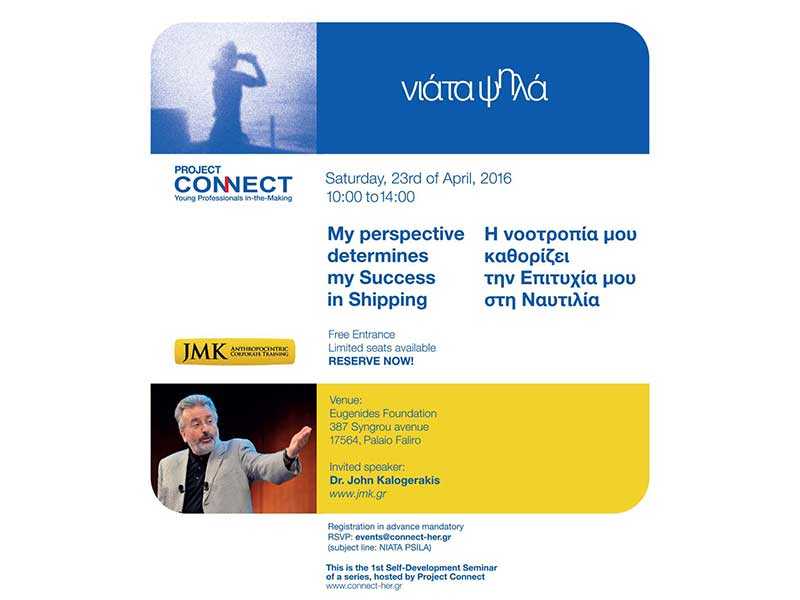 «To honor the youth of Greece, with Dr. John Kalogerakis who has actively inspired young people for decades, we decided to entitle this series “ΝΙΑΤΑ ΨΗΛΑ” – “My perspective determines my success in Shipping”», Irene Notias said fondly. Ms. Notias is the founder and chairwoman of the Project Connect, the non-for-profit organization, aimed at assisting and motivating “Young Professionals in-the-Making” as they begin their lives in the professional environment!